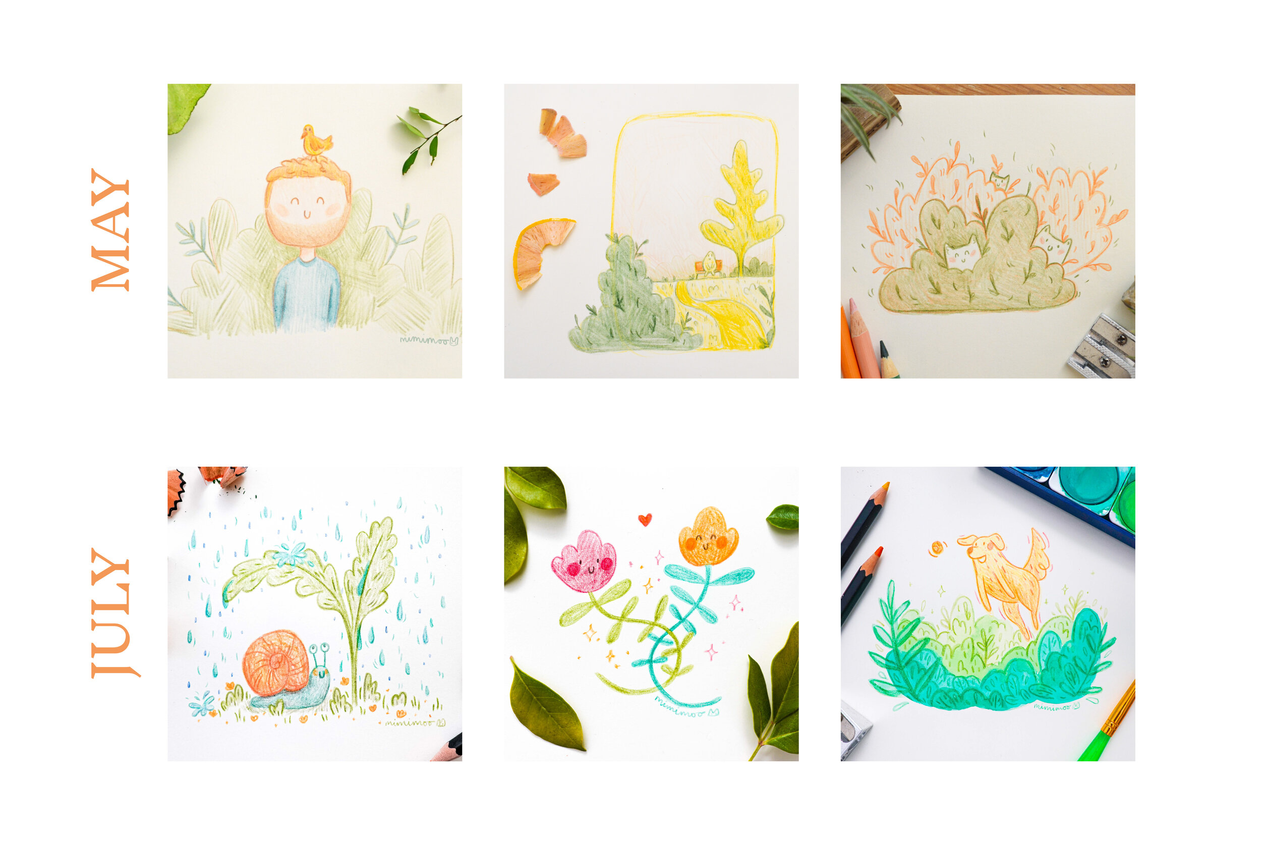 You can see below how my drawings started quite soft, shy and contained, and over time have expanded into bigger, bolder scenes with more elements and more interesting characters.